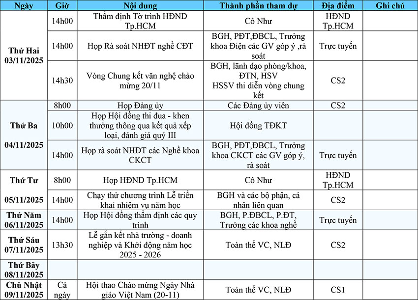 Lịch công tác tuần 10 (từ ngày 03/11/2025 đến ngày 09/11/2025)