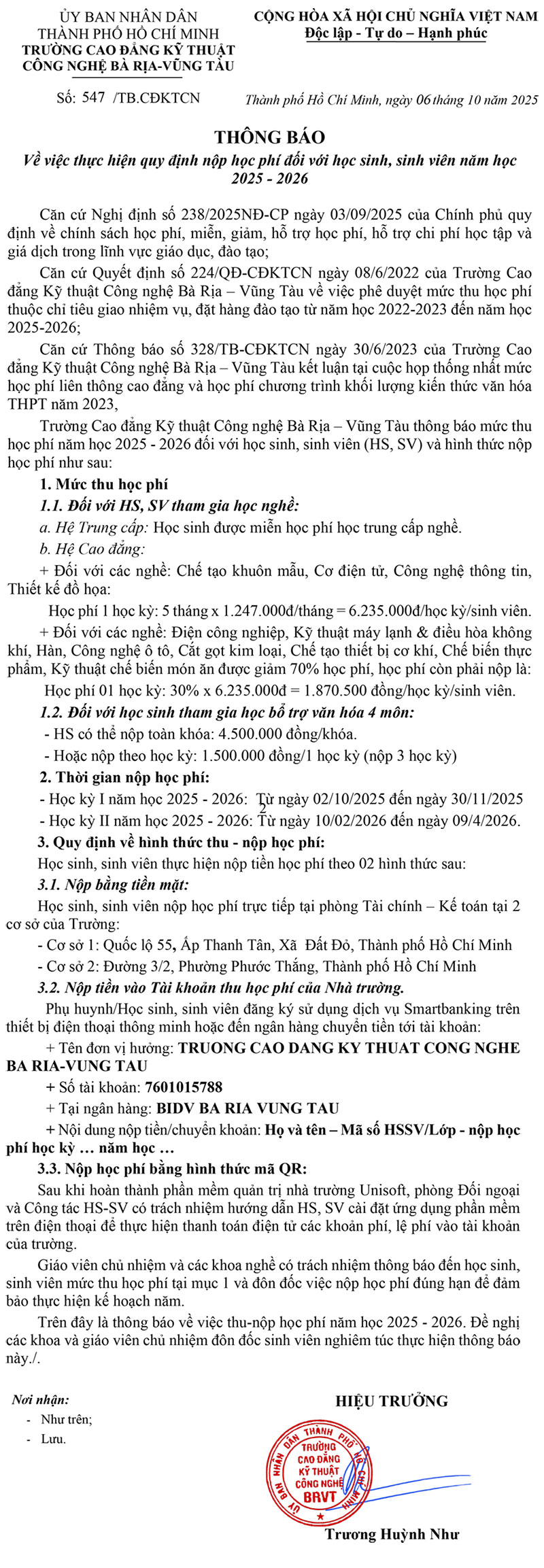 Thông báo thực hiện quy định nộp học phí đối với học sinh, sinh viên năm học 2025 – 2026