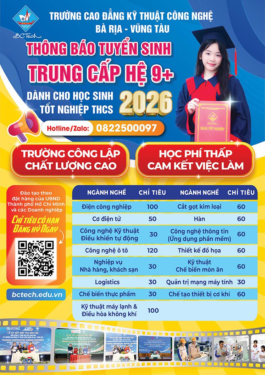 Tuyển sinh Trung cấp (Hệ 9+) hệ chính quy năm 2026