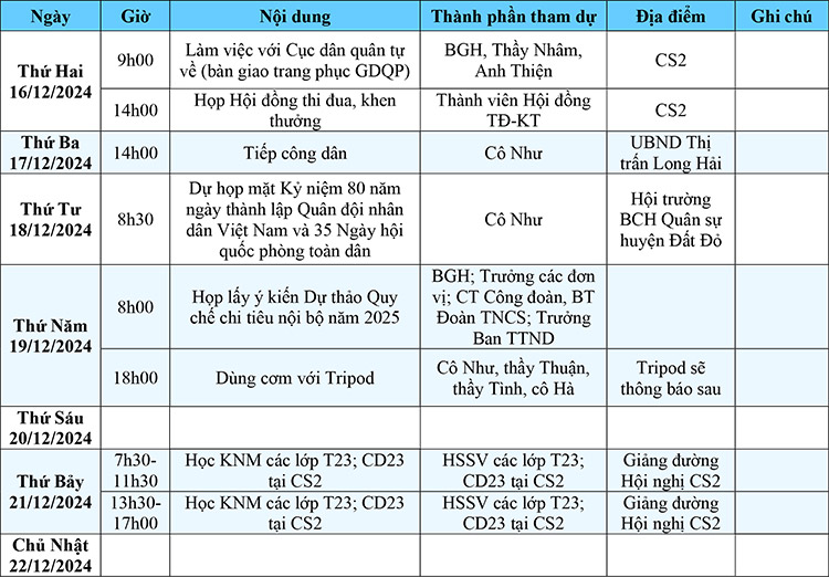 Lưu ý: Lịch công tác thay cho giấy mời dự họp, đề nghị các cá nhân, bộ phận theo dõi và thực hiện.